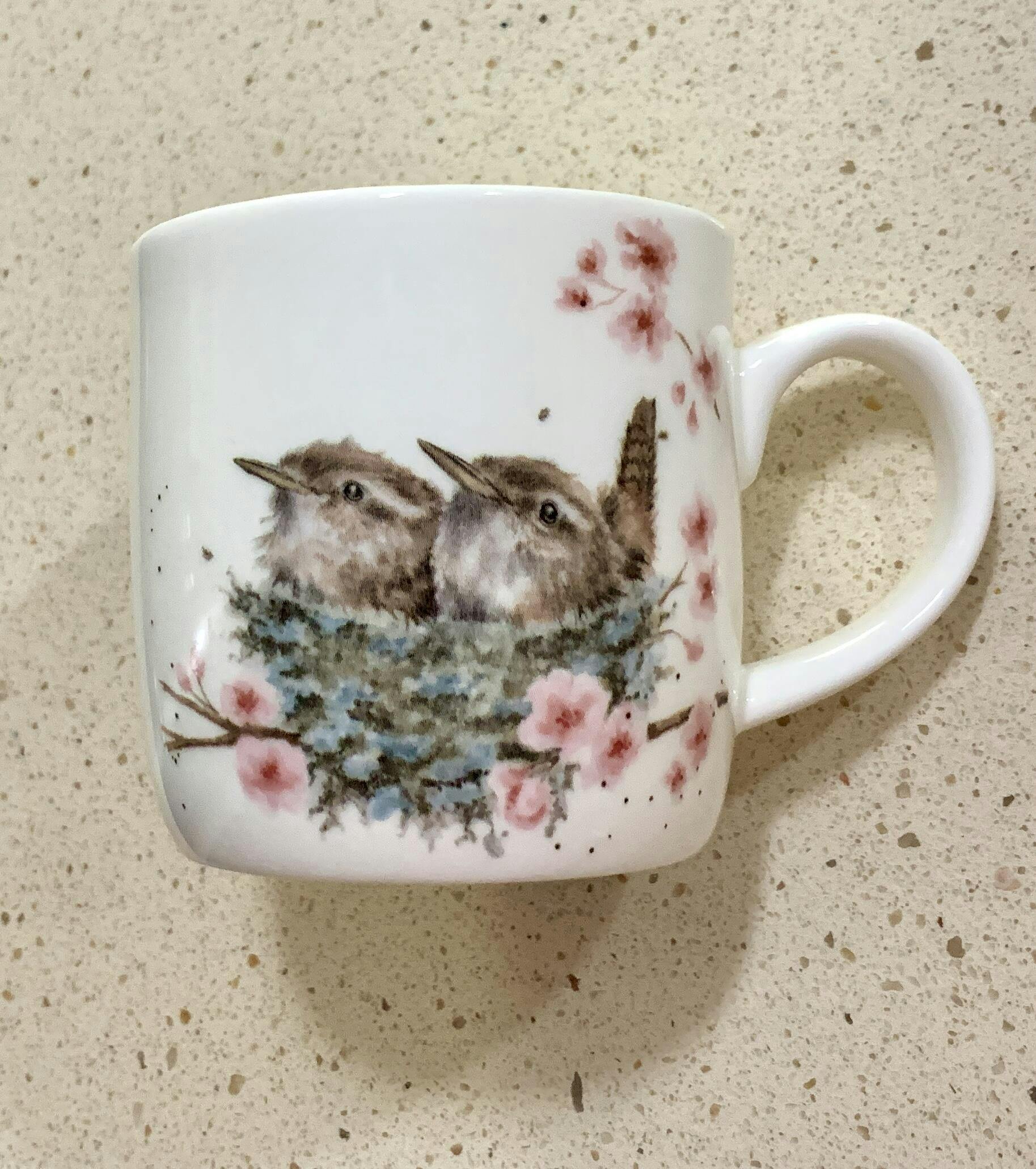 This beautifully illustrated ‘Feather your nest’ wren 11 oz mug made from fine bone china produced by Royal Worcester would make a lovely gift or perfect addition to your kitchen. This mug has a different image on the front and back and a third image on the inner rim. Capacity 11oz/0.3L, Dishwasher and Microwave Safe.
